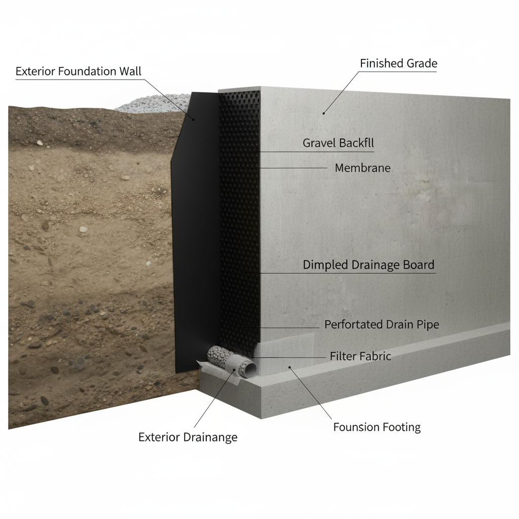 - Exterior Waterproofing Membranes require excavation and application, with costs ranging from $3,000 to $10,000 depending on foundation size and membrane type.