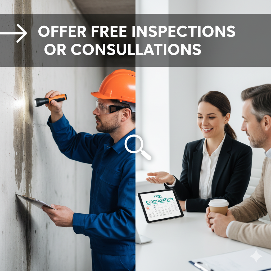 Offering free inspections or consultations can considerably enhance your basement waterproofing business’s appeal to potential customers. This strategy not only showcases your expertise but also builds trust.