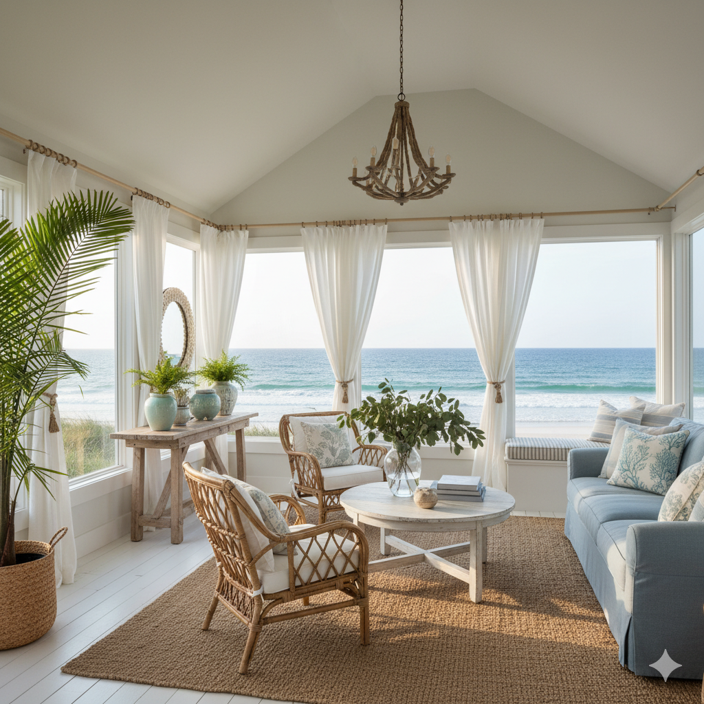 This sunroom design emphasizes light, featuring large windows that invite nature inside. Coastal decor, with its soft blues and sandy neutrals, creates a tranquil atmosphere.