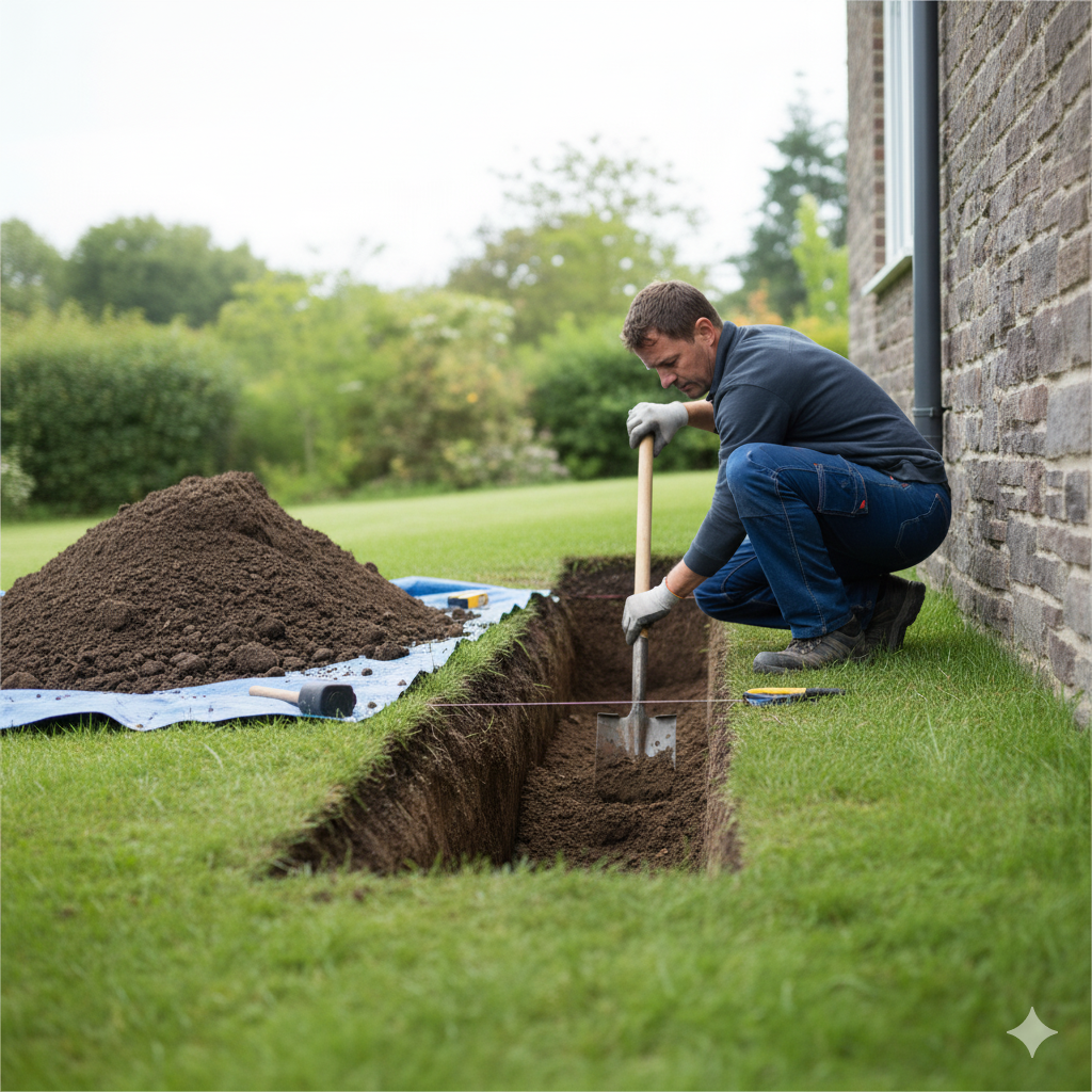- Excavate a trench with a consistent slope of at least 1% to ensure effective water flow away from the basement.
